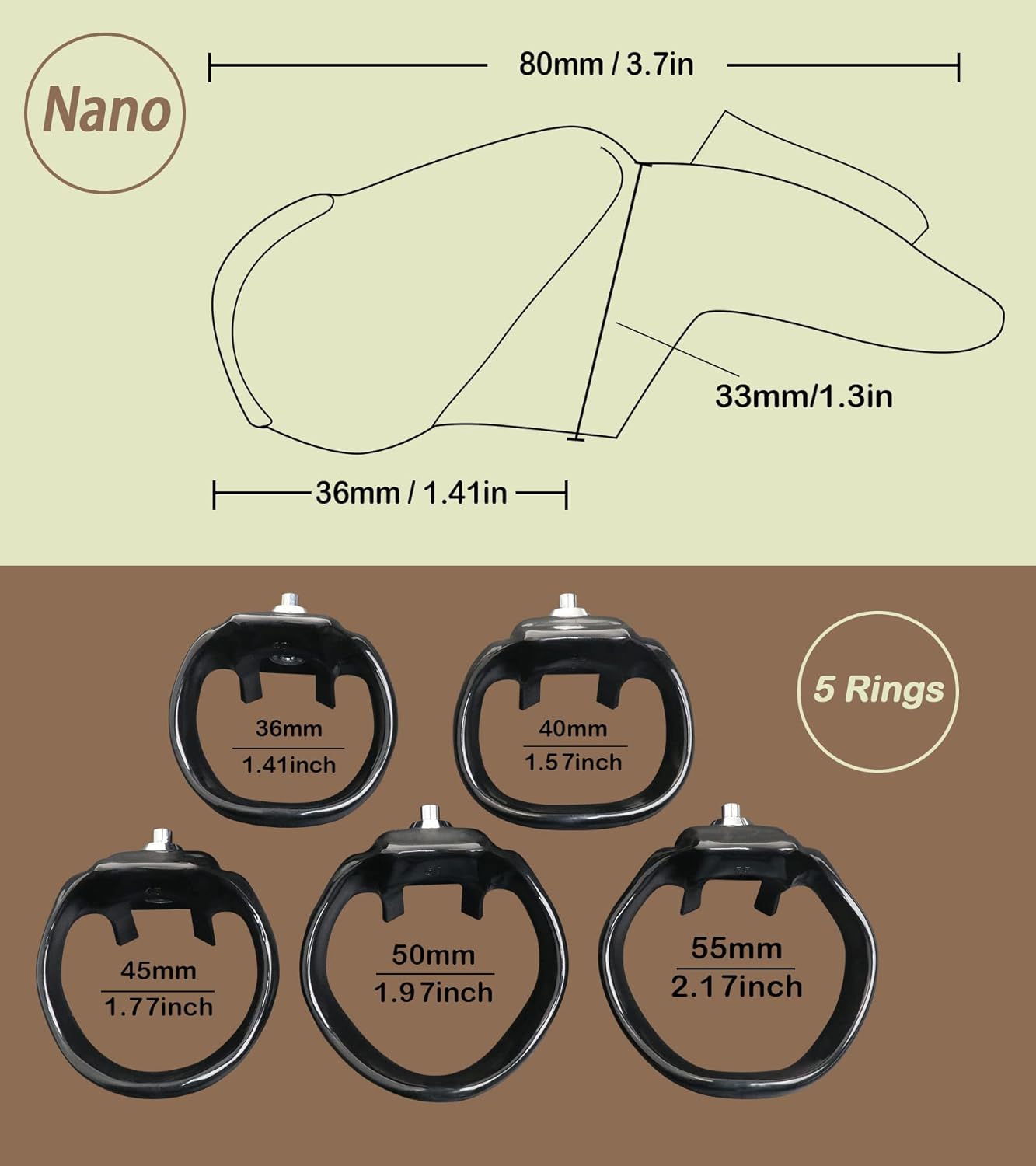 Select the perfect fit with cage sizes as pictured and a range of ring sizes (36mm/40mm/45mm/50mm/55mm). Each set includes 1 cage, 1 ring, and 2 keys, providing everything you need for a seamless experience. With a net weight of 70g-90g, our V5 Chastity Cage is lightweight yet robust, ensuring comfort without compromising durability.